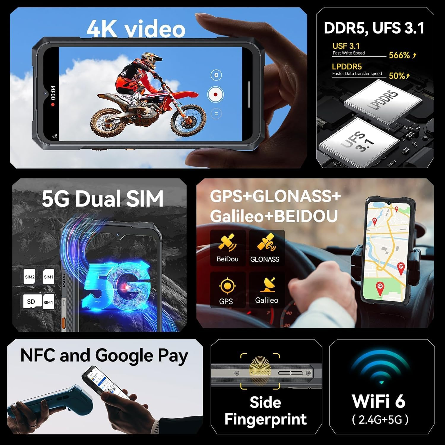 5G Dual SIM Cell Phone(Note: Not support At&t, Metro,Cricket and Verizon, Please confirm the carrier before purchasing ! ) : Welcome to a new era, CUBOT has prepared the latest 5G technology for Kingkong X, with network speeds equivalent to 700% faster than 4G. CUBOT King Kong X Phone with MTK7050 5G processor, crafted on a cutting-edge 6nm architecture and running at 2.6GHz. Enjoy ultra-fast data access and app loading times with DDR5 RAM and UFS 3.1 storage. Say goodbye to lag and hello to seamless performance. Stay connected wherever you are with dual 5G SIM slots. Enjoy the fastest internet speeds with WiFi 6 and seamless transactions with NFC.