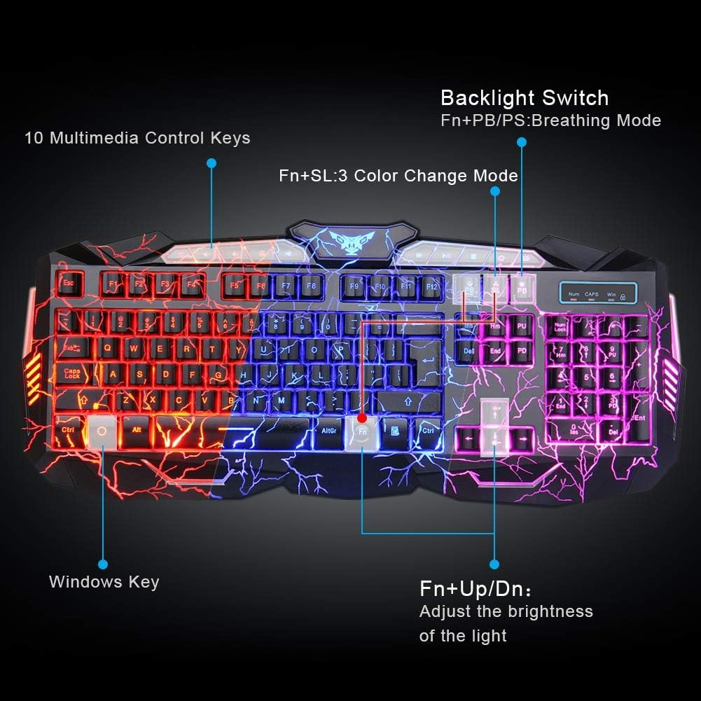 10 Multimedia control keys on keyboard, 7 colors rainbow glare automatic breathing light mouse